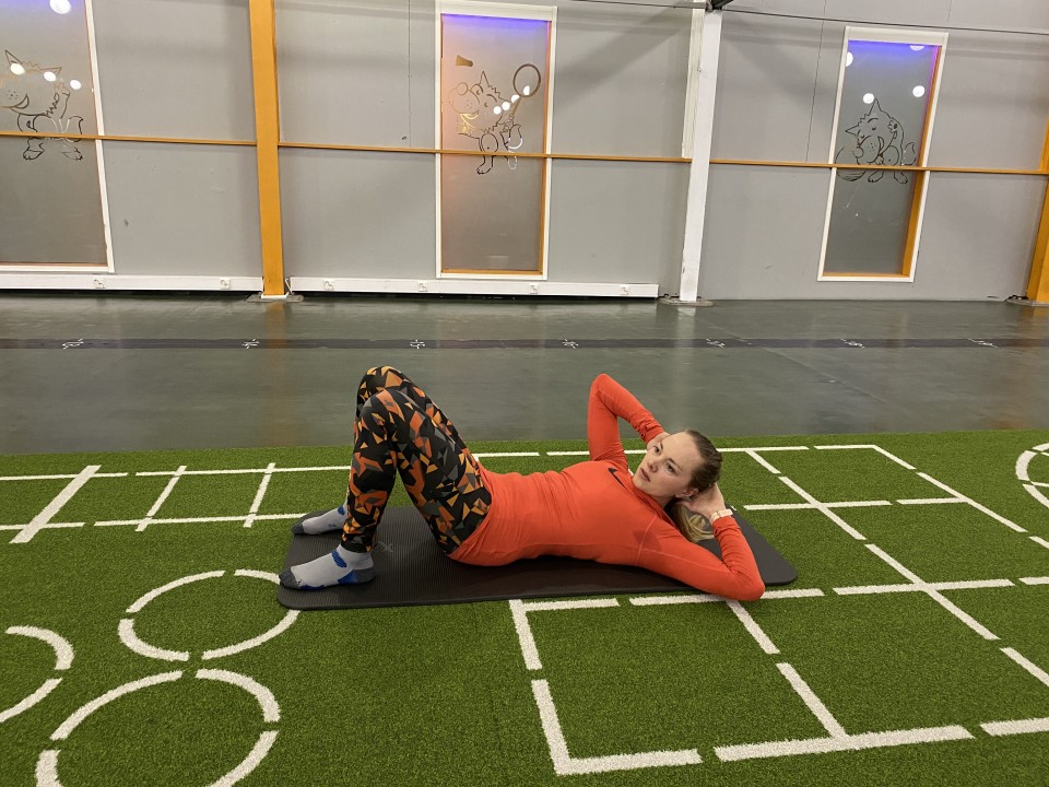 - Asetu selinmakuulle latialle polvet koukussa ja jalat lattiassa hartioiden leveydellä ja laita kädet tukemaan kevyesti päätä.